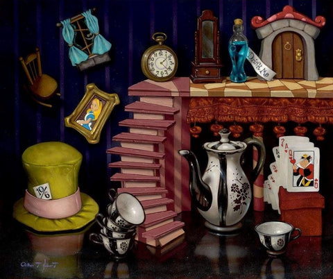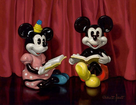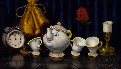 Clinton has always been a fan of old movies, old music, and acting. He often imagines that the objects in his still-lifes are actors on a stage. He tries to give each painting a feeling of being “alive", something he learned from Disney movies. The idea that a clock could talk, a mushroom could dance around, or just the feeling that the objects in a painting might get up and walk away at any second, all came from time spent with Disney."The story behind many of my paintings is that the objects are finished with their performance and are taking a bow, which is why they are lined up on stage. I even go so far as to create personalities for them, a happy eggplant, or a sour apple, and I think of that while I am painting. Even the music that is playing in the background needs to fit the scene. Whether I am working on a Disney painting and listening to the soundtrack of whichever scene I am working, a wave with some beach music or a New Orleans mask and listening to some Jazz, the music must fit the mood of the painting.”