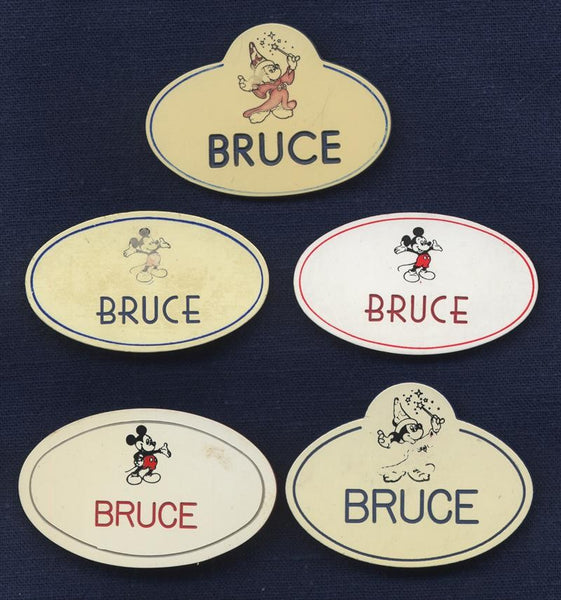 5 Disney "BRUCE" NAME BADGES Issued to Imagineer BRUCE GORDON, 1980s-1990s
