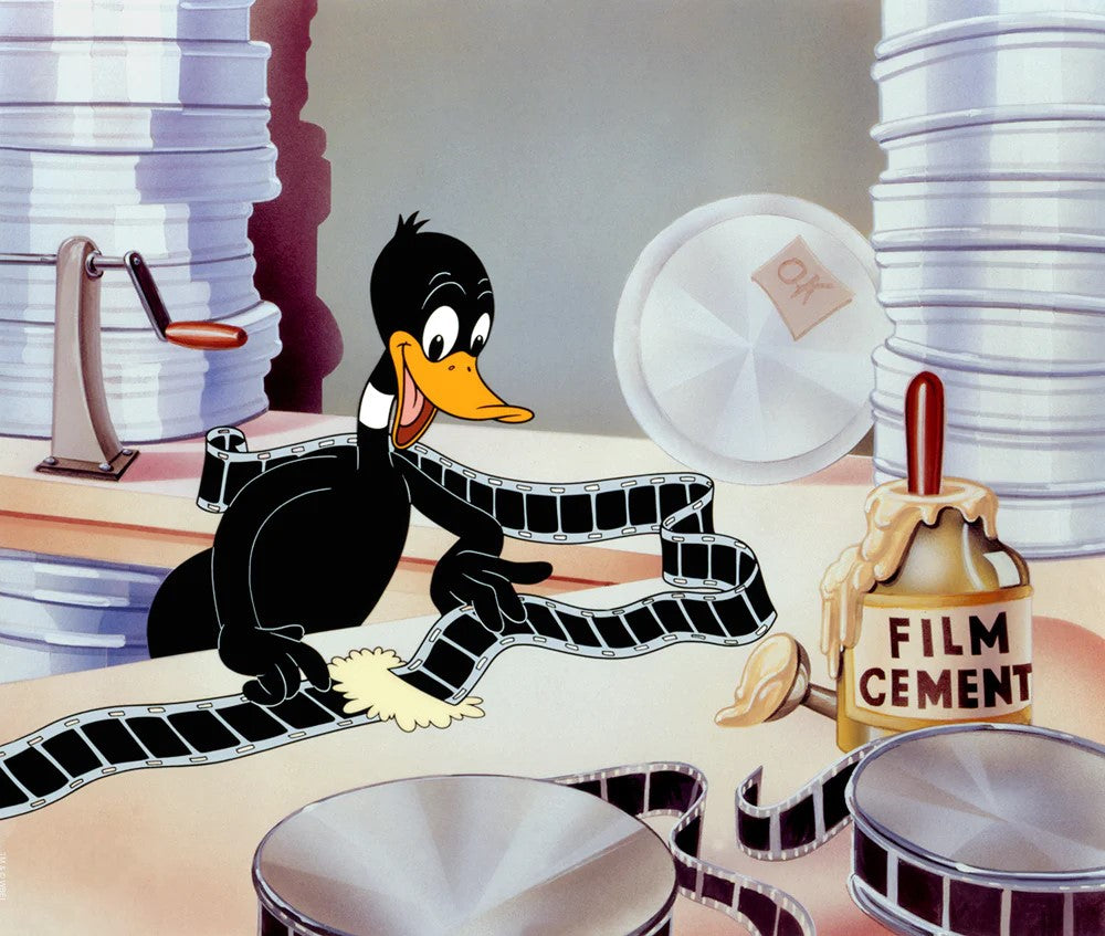 ABOUT THE IMAGE: In Tex Avery’s hilarious 1938 short, “Daffy Duck, Film Editor,” that darn-fool duck goes from a hollow-wooded pond to a big Hollywood Studio, called Wonder Pictures, where their tag line is, “If it’s a good picture, it’s a Wonder!” After wreaking havoc on a sound stage in full production, this scene finds our hero splicing together “a REAL feature” which ultimately lands him a job directing for the studio.