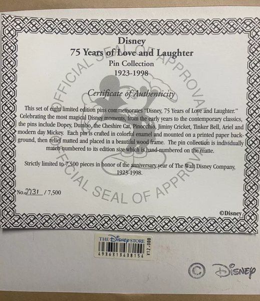 Disney 75 Years of Love and Laughter Pin set of 8 framed Ltd Ed Dumbo Mickey