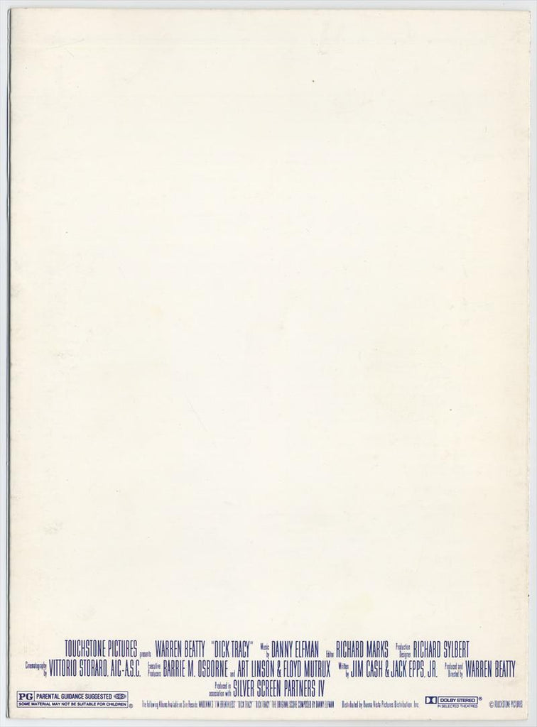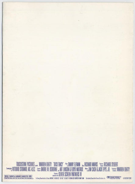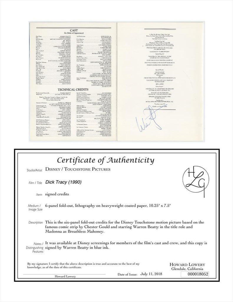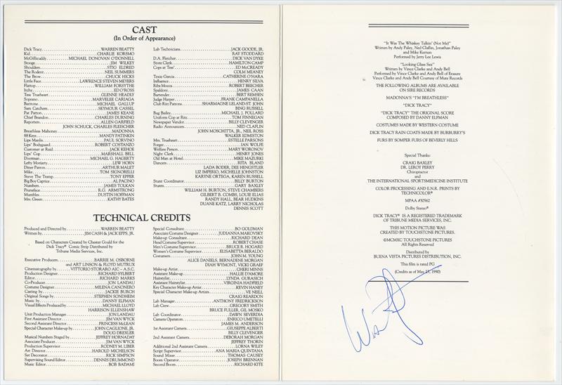 This is the six-panel fold-out credits for the Disney Touchstone motion picture based on the famous comic strip by Chester Gould and starring Warren Beatty in the title role and Madonna as Breathless Mahoney. It was available at Disney screenings for members of the film's cast and crew, and this copy is signed by Warren Beatty in blue ink.