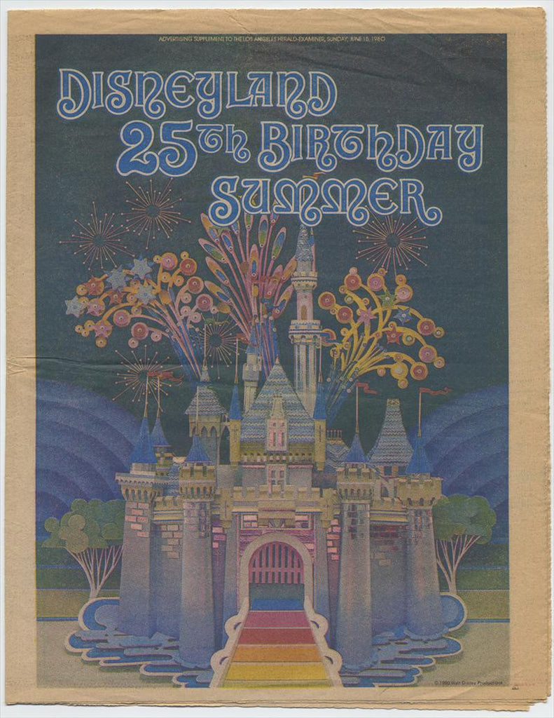 This Advertising Supplement to the Los Angeles Herald-Examiner was issued with the newspaper on June 15, 1980 to promote visits to Disneyland in the summer of its 25th anniversary year. It features illustrated articles and advertisements including "Remembering Walt" by James Bacon, "Big Bands Herald Touch Dancing Return", "Top Music Stars to Appear at Park", "Fireworks: Heavenly Fantasy" "Matterhorn's Abominable Presence", "Big Thunder Perpetuates Disney Pledge", (Jack) "Valenti Pays Homage to Walt Disney" and more.