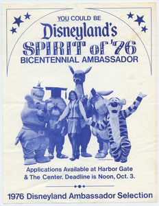 Unused 4-page illustrated applications for the position of Disneyland Ambassador for the years 1975 and 1976 when Disneyland and Walt Disney World's Magic Kingdom were marking the American Bicentennial with the spectacular "America on Parade." Each invites young women "among the permanent and part-time employees" of Disneyland to apply for the position. For 1976 Seasonal employees were also eligible. To qualify an applicant had to be an employee; 18 years or older; single and agree to remain so for a period of one year; and agree to serve, if selected, as "Disneyland Ambassador" for a period of one year.