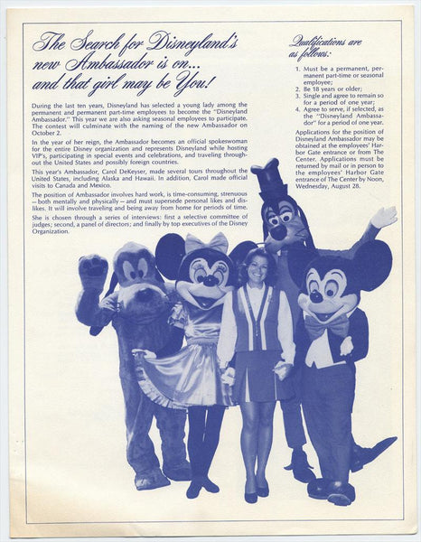 Each includes a message from the current Ambassador—Carol DeKeyser in 1975 and Kathy Smith in 1976—and they are seen in their roles in pictures inside. The application states that "the Ambassador becomes an official spokeswoman for the entire Disney organization and represents Disneyland while hostessing VIP's, participating in celebrations and special events, and traveling throughout the United States and in foreign countries." Included is a single-sided, one-page flyer for the "1976 Disneyland Ambassador Selection."