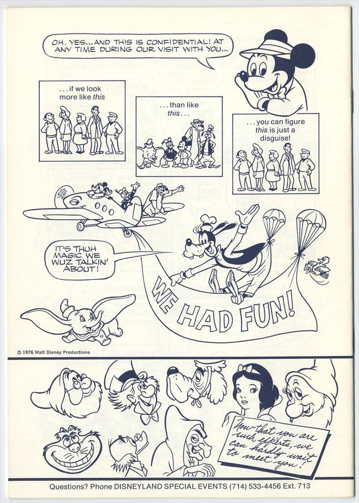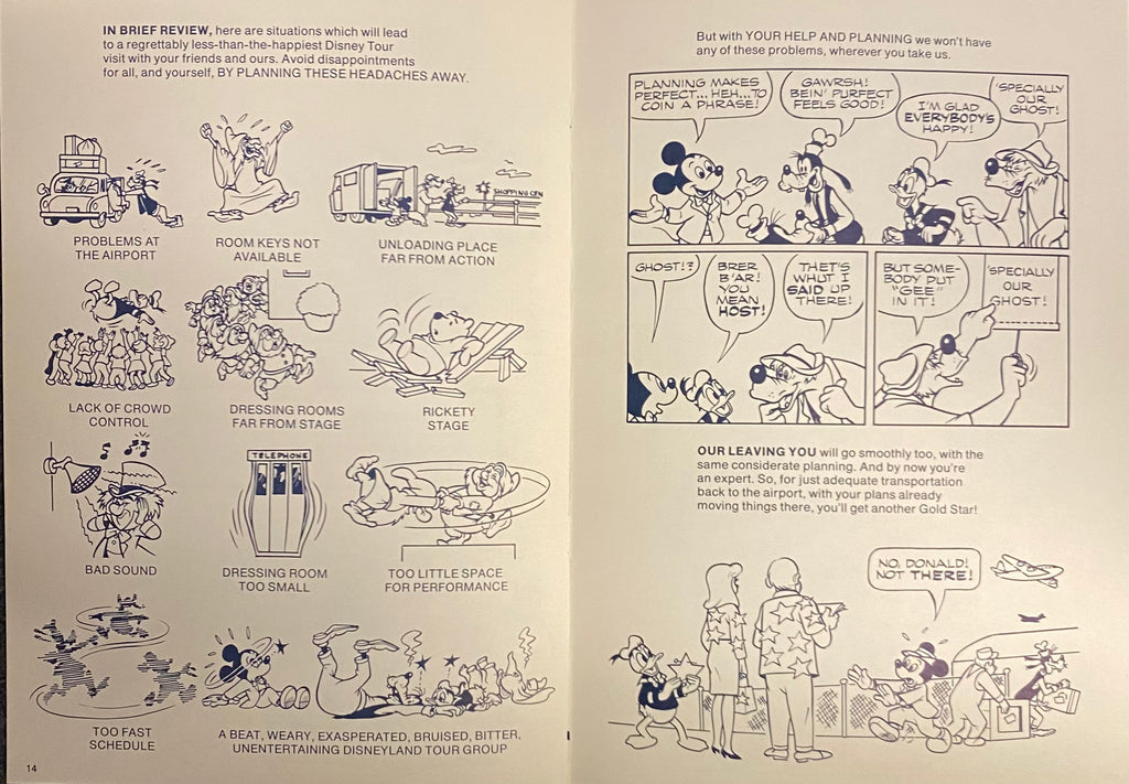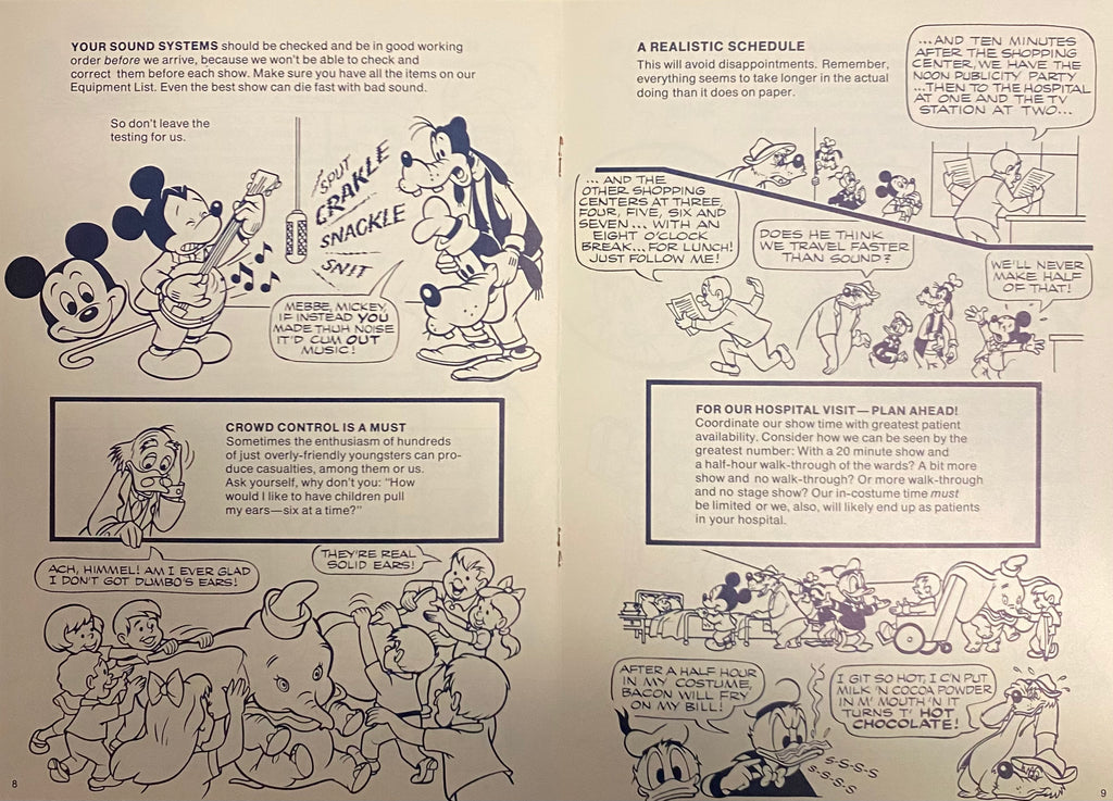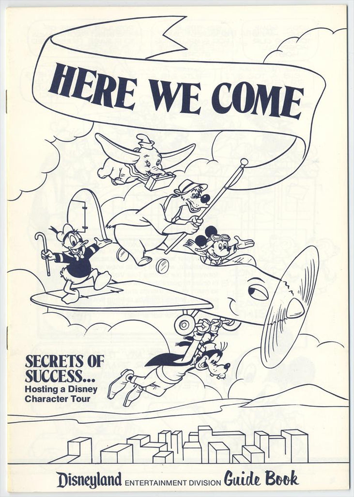 Disneyland Entertainment Division published this Guide Book for distribution to organizations hosting a tour by the Disney costumed characters. It is completely illustrated with black-and-white drawings and provides information for hospitals, retail locations, and such. Topics covered include airport arrival, dressing rooms, stages, parades, crowd control, scheduling, sound systems, parades and more. It is presented in a light-hearted way and every page features comic-style drawings of the Disney characters making points about how to plan for a successful event.