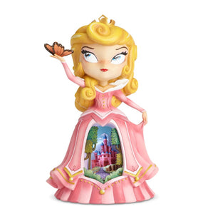 Curious and thoughtful, Princess Aurora looks even more dove-like in this handcrafted design by cartoon folk artist, Miss Mindy. An illuminated inset diorama scene depicts a beautiful castle lit with LED lights.